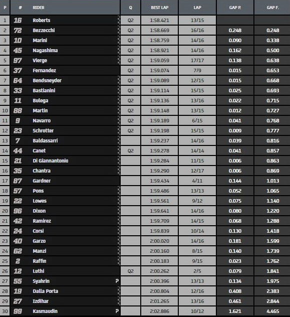 A trois minutes de la fin, Joe Roberts fait sensation avec son 1’58.421. C’est le nouveau record de la piste. Lüthi tombe une seconde fois au virage 2. On en restera là. Bezzecchi et Marini suivent de même que Nagashima et Vierge. Fernández mène le reste du peloton devant notamment un Bendsneyder à suivre avec sa NTS. Martin ferme le top 10 et Canet avec sa 14e position est virtuellement en Q2…