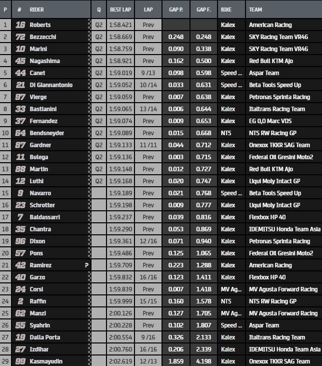 A surveiller également Tom Lüthi (Kalex, Liqui Moly Intact GP), le plus rapide en FP1, qui s’est fait piéger en FP2, tout comme Remy Gardner (Kalex, Onexox TKKR SAG Team).