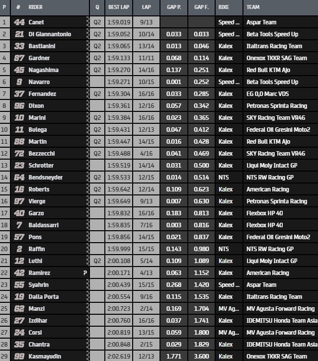 Après 12 minutes, le rookie Arón Canet (Speed Up, Aspar team) s’empare du commandement en 1’59.271, soit un chrono très proche de son 1’59.215 réalisé hier.
