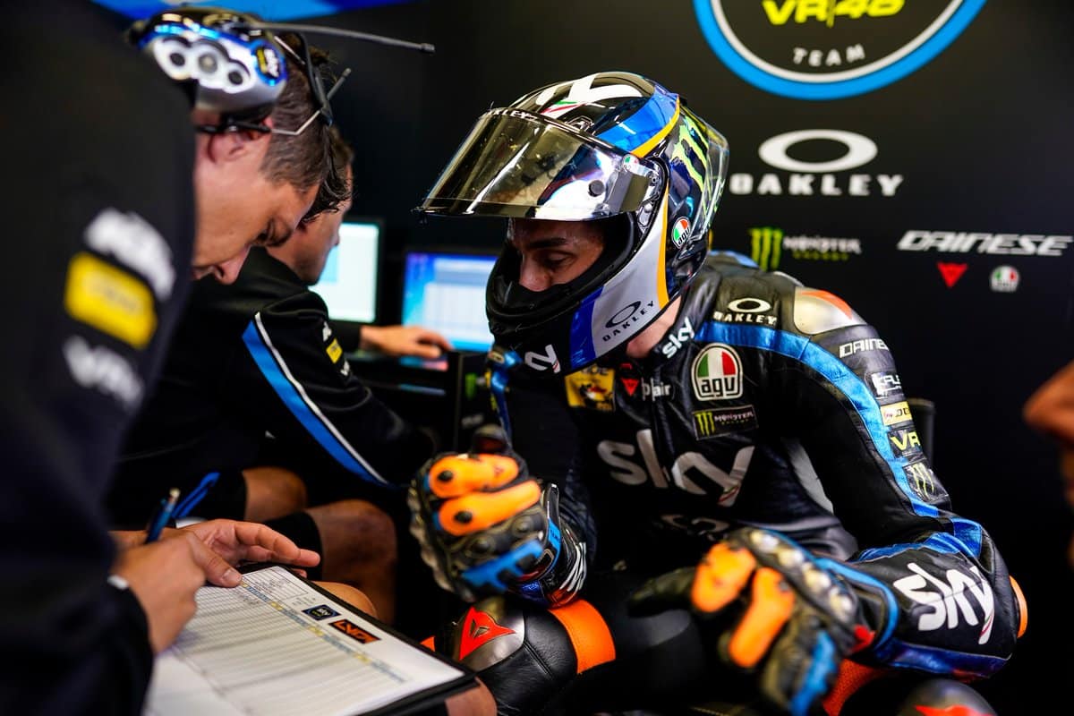 Septième à 40 points de son copain de l’académie VR46, Lorenzo Baldassarri, et à un point derrière Álex Márquez, celui qui est maintenant le fer de lance du team VR46 titré en 2018 avec Bagnaia doit aussi se faire respecter par son équipier débutant dans la catégorie Bulega. Une situation compliquée qu’il explique à la fois par son état physique, le nouveau format de la discipline et ses derniers impératifs techniques.