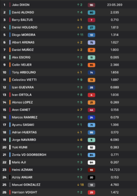 Il devra toutefois faire attention à Jake Dixon et Aron Canet, respectivement 6 et 8 points derrière lui.