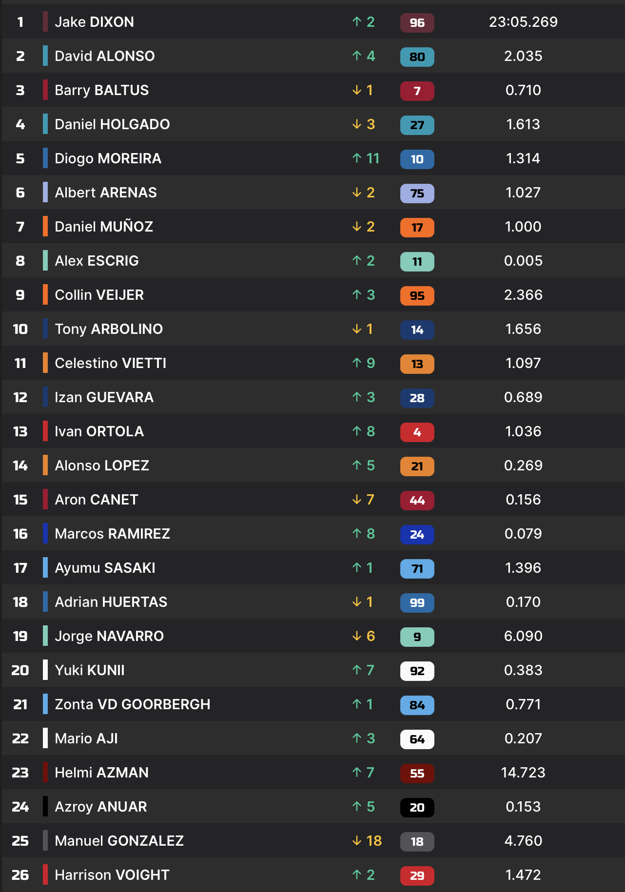 Il devra toutefois faire attention à Jake Dixon et Aron Canet, respectivement 6 et 8 points derrière lui.