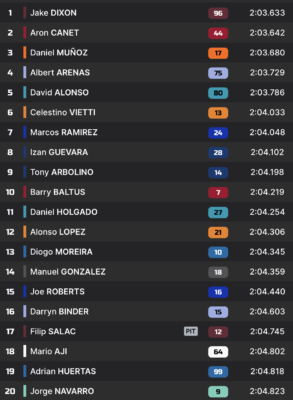 Devant le drapeau à damier, personne n’est en mesure d’arrêter Jake Dixon, qui aura dominé cette séance de bout en bout. L’homme le plus rapide de l’histoire du Moto2 sur le circuit de Sepang se replace parmi les favoris à la pole position juste avant les Qualifications ! Aron Canet et Daniel Munoz complètent le top-3.