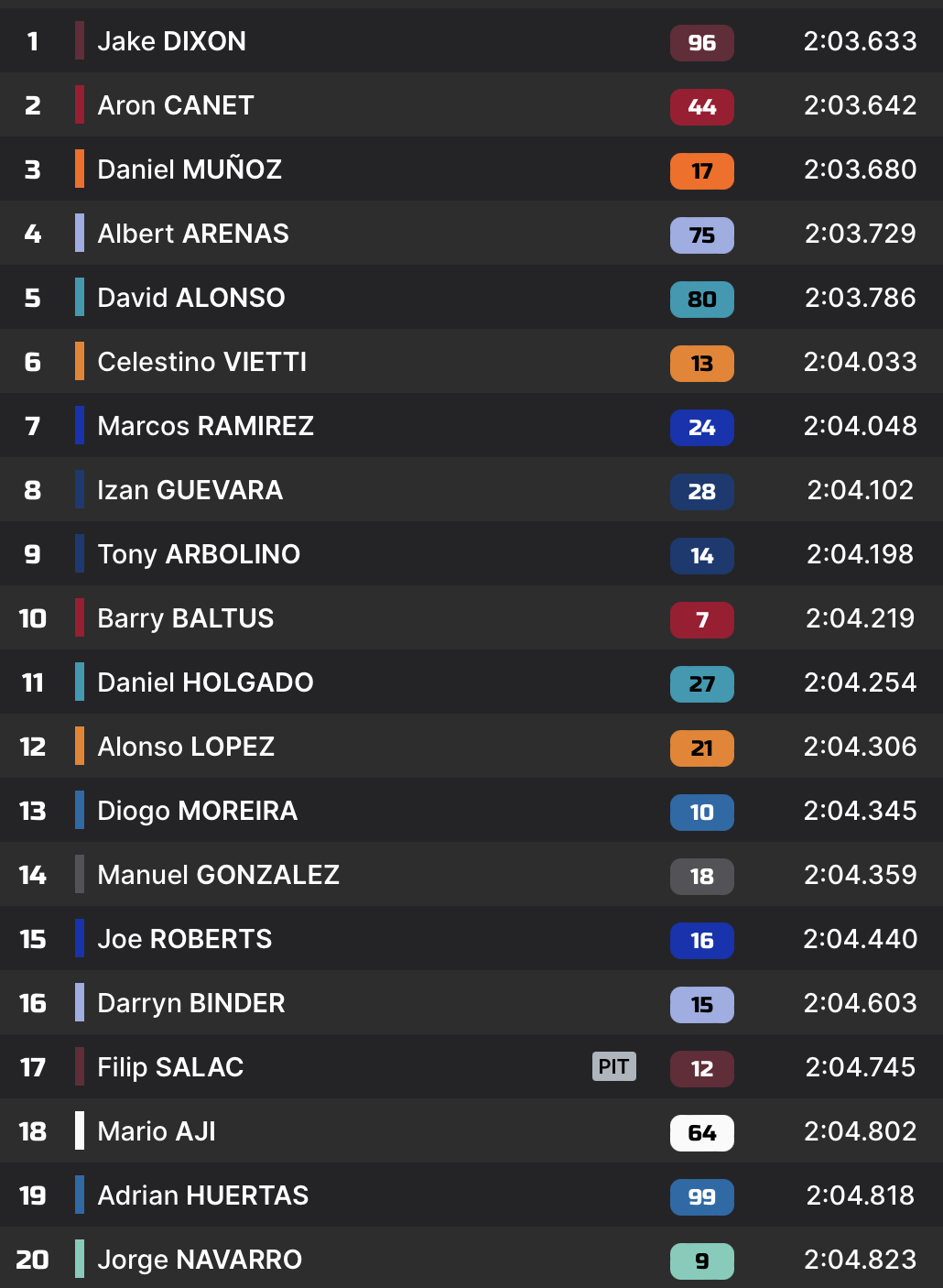 Devant le drapeau à damier, personne n’est en mesure d’arrêter Jake Dixon, qui aura dominé cette séance de bout en bout. L’homme le plus rapide de l’histoire du Moto2 sur le circuit de Sepang se replace parmi les favoris à la pole position juste avant les Qualifications ! Aron Canet et Daniel Munoz complètent le top-3.