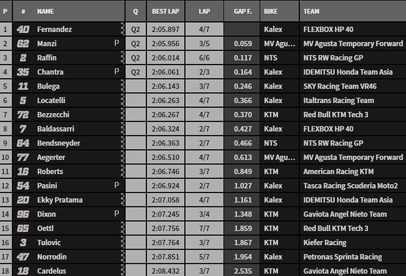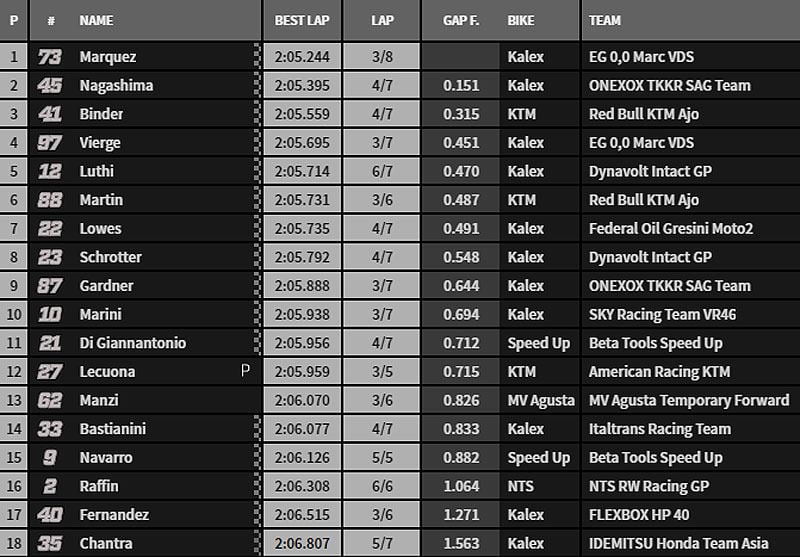 Une mission pas si simple car ces derniers sont dans le coup. Il y a Brad Binder mais aussi Lüthi et Navarro. Que va nous donner cette séance qualificative qui se déroulera en deux mi-temps de 15 minutes chacune ? Avant de répondre à cette question, voici le tableau qui résume les faits.