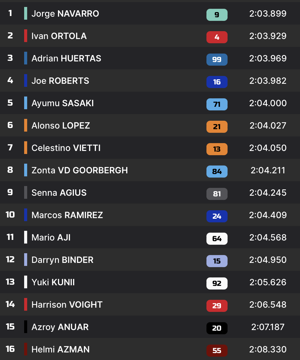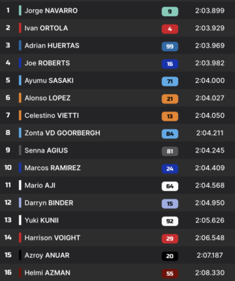 Q1 2’05.202 Somkiat Chantra 2’03.899 Jorge Navarro