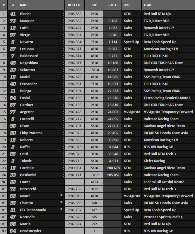Encore 5 tours et devant Binder tient bon face à un Marquez qui donne tout mais qui ne parvient pas à recoller à la KTM. Lüthi, 3e, revient dans sa roue. Vierge s’est débarrassé de Nagashima pour se placer maintenant 4e.
