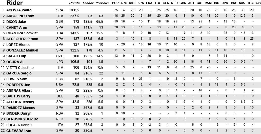La troisième place du championnat devrait se jouer entre Jake Dixon (Inde GASGAS Aspar Team), Aron Canet (Pons Wegow Los40), Somkiat Chantra (IDEMITSU Honda Team Asia), Fermin Aldeguer (Beta Tools SpeedUp) et Alonso Lopez (Beta Tools SpeedUp).