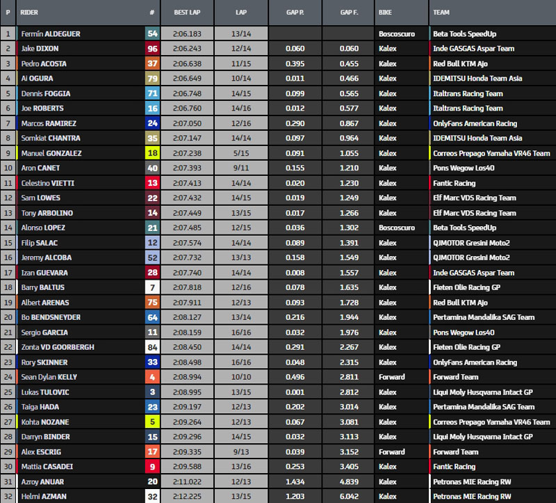 A la reprise, Sam Lowes progresse à la sixième place, Marcos Ramirez à la troisième, mais c’est Pedro Acosta qui améliore le meilleur chrono en 2’06.638. Dans la foulée, Ai Ogura se positionne deuxième à seulement 11/1000, pendant que Sean Dylan Kelly part violemment à la faute au virage #9.