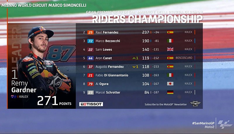 Au championnat, Remy Gardner mène toujours avec 271 points devant Raúl Fernández qui en possède 237. Un écart de 34 unités qui n’est finalement pas insurmontable quand il reste encore quatre courses à courir…