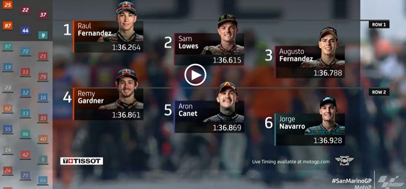 Alors que la Q1 s’est déroulée en partie sur piste humide, les pilotes de la Q2 ont pu profiter de conditions quasi-parfaites pour se départager. C’est Raúl Fernández (Red Bull KTM Ajo), déjà en tête le matin, qui a signé la pole position avec un tour éclair en 1’36.264. Juste derrière, on retrouve le poleman de la semaine dernière, Sam Lowes (ELF Marc VDS Racing). Le coéquipier du Britannique, Augusto Fernández (ELF Marc VDS Racing), complète le top 3.