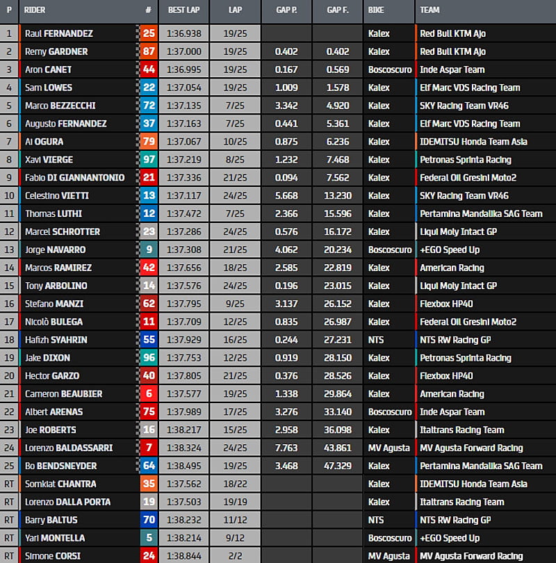 Dans le dernier tour, Remy Gardner revient comme un boulet sur son coéquipier mais subit une glissade de l’arrière dans la partie rapide du circuit. L’Australien reste sur ses roues mais doit se contenter de la deuxième place.