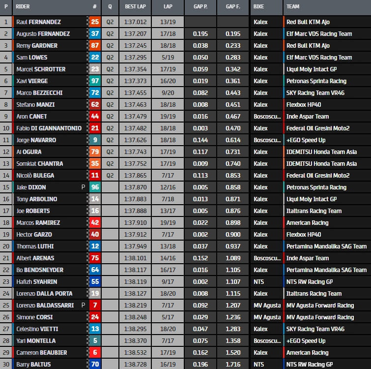 Xavi Vierge (Petronas) est quatrième, devant Sam Lowes (Marc VDS), Nicolò Bulega (Gresini) et Hafizh Syahrin (NTS). Le Top Ten était fermé par Joe Roberts (Italtrans), Stefano Manzi (Pons) et Jake Dixon (Petronas).
