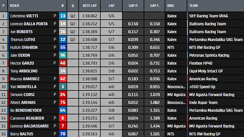 Fin de session de Q1, les pilotes qui sont parvenus à se qualifier pour la Q2 sont: Vietti en 1.38.062s, Dalla Porta en 1.38.212s, Roberts en 1.38.369s et Luthi en 1.38.408s.