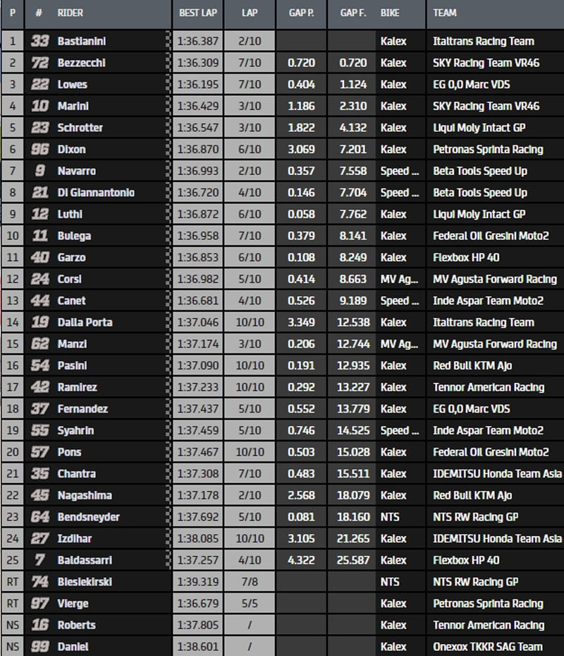 La course repartira pour 10 tours avec le classement établi à la fin du sixième tour, c’est-à-dire Enea Bastianini, Lucas Marini, Xavier Vierge, Marco Bezzecchi, Fabio Di Giannantonio, Sam Lowes, Marcel Schrötter (Kalex, Liqui Moly Intact GP), Jorge Navarro (Speed Up, +Ego Speed Up), Arón Canet (Speed Up, Aspar team), Jake Dixon, Nicolò Bulega (Kalex, Federal Oil Gresini Moto2), et Tetsuta Nagashima (Kalex, Red Bull KTM Ajo) qui se déplace avec deux béquilles suite à la très violente chute qu’il a subie ce matin.