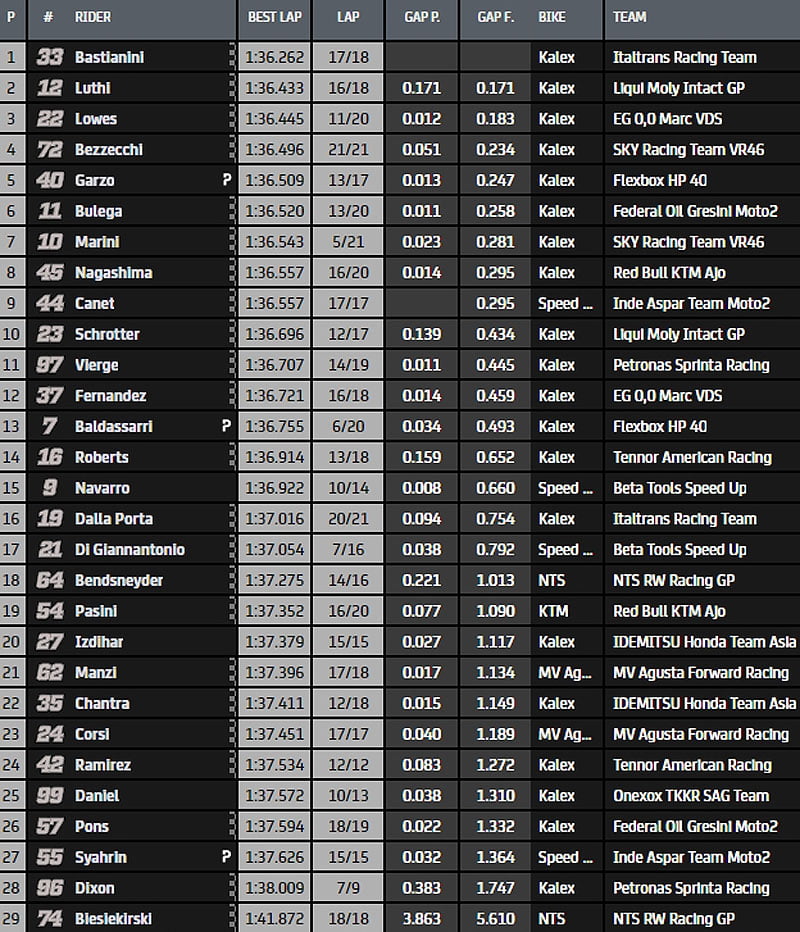 A 1min du final Luthi puis Bastianini signe le meilleur temps de la séance en 1.36.399s. Luthi tourne en 1.36.433s. Lowes est 3e avec un chrono en 1.36.445s.
