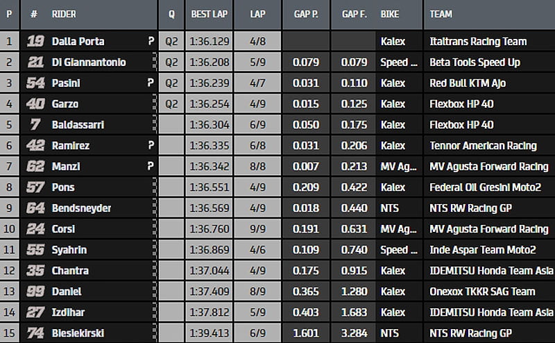 Fin de séance et Dalla Porta, Di Giannantonio, Pasini et Garzo rejoindront leurs comparses déjà qualifiés pour l’épreuve de Q2.
