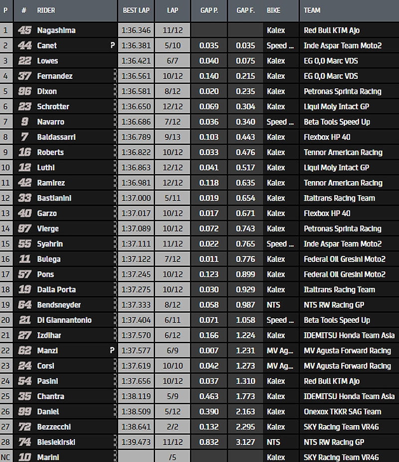 En vue du drapeau à damier, Nagashima donne le coup de collier qui le met en tête en 1’36.346. Mais il chute et reste sur le bord de la piste comme assommé. Il est évacué à la civière … On en restera là avec Canet, Lowes, Fernandez et Dixon dans le top 5. Bastianini est seulement douzième, mais sa séance est plus positive que celle des deux pilotes VR46…