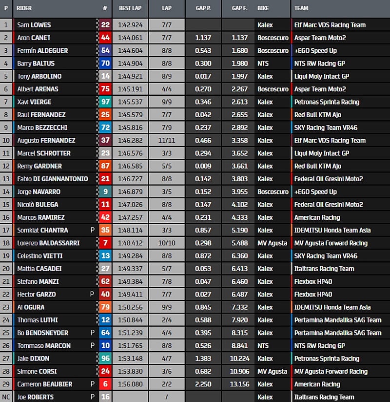 Aron Canet ouvre la deuxième ligne devant le premier des Italiens, Celestino Vietti (Sky Racing Team VR46) et Marcos Ramirez. Excellente performance pour Stefano Manzi (HP Pons) qui termine en septième position devant Thomas Luthi et Albert Arenas. Raul Fernandez complète le top dix.