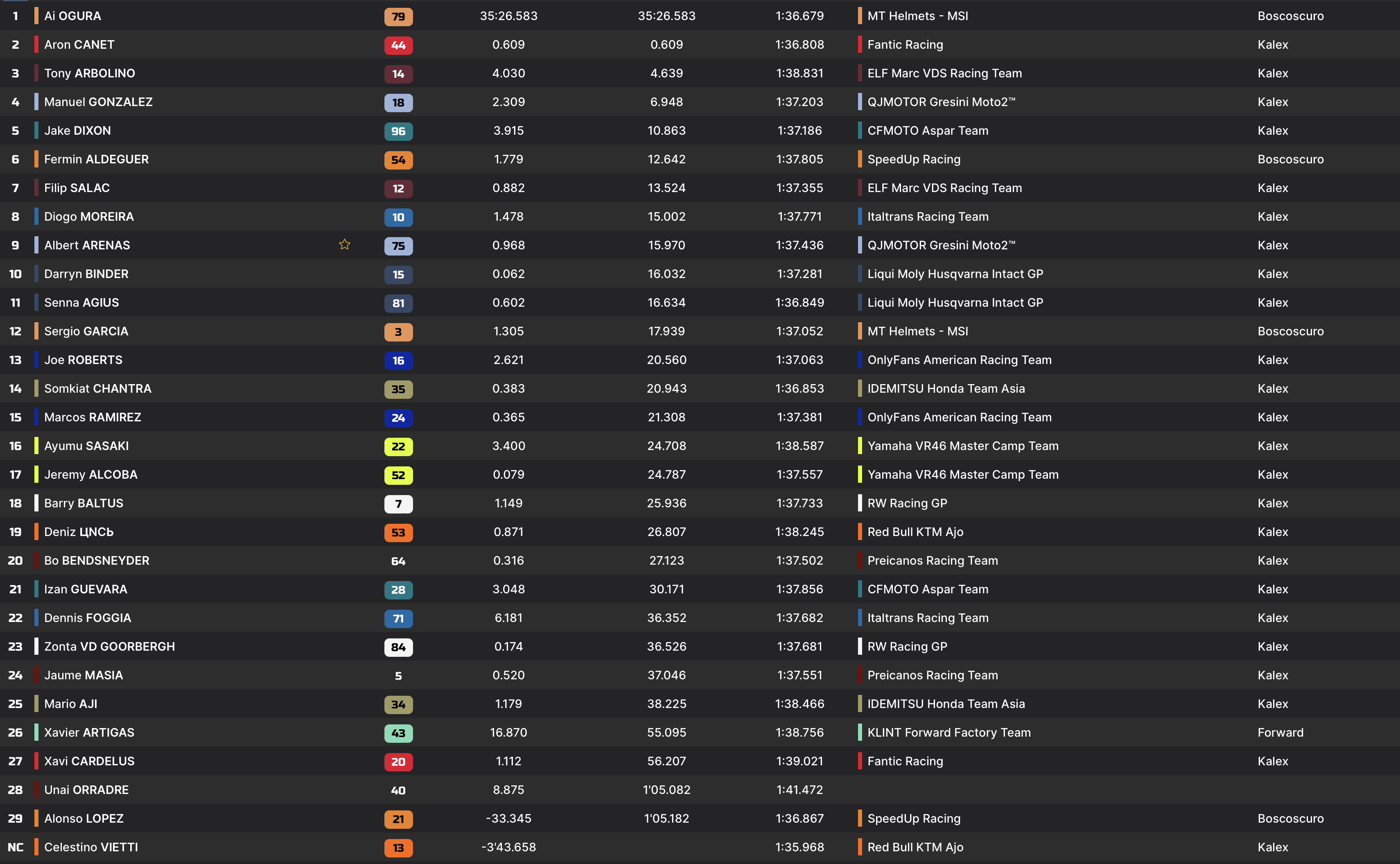 Alors que Gonzalez perd en rythme, Vietti continue sa remontée sur le top-3. La lutte pour la victoire se fera à quatre ! Après s’être montré suffisamment patient, Ai Ogura attaque Aron Canet et le passe. Il devient ainsi le troisième leader différent en Moto2 de dimanche. Derrière, le pilote KTM Ajo se porte dans les échappements de la Marc VDS d’Arbolino, mais chute au virage 16, à l’image d’Alonso Lopez en début de course.