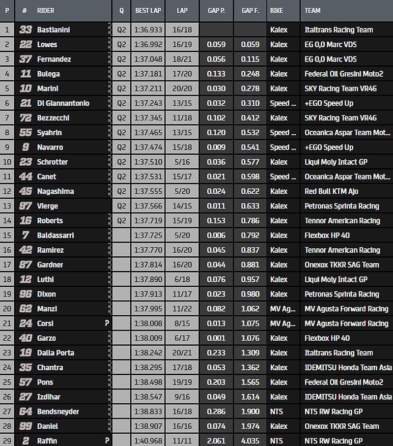 Le coéquipier de Lowes, Fernandez et vainqueur l’an passé à Misano, s’empare du leadership en 1.37.287s. Lowes ne s’en laisse pas compter et reprend la tête des opérations en améliorant son chrono en 1.37.257s. Marini, Schrotter et Bastianini composent le top 5.