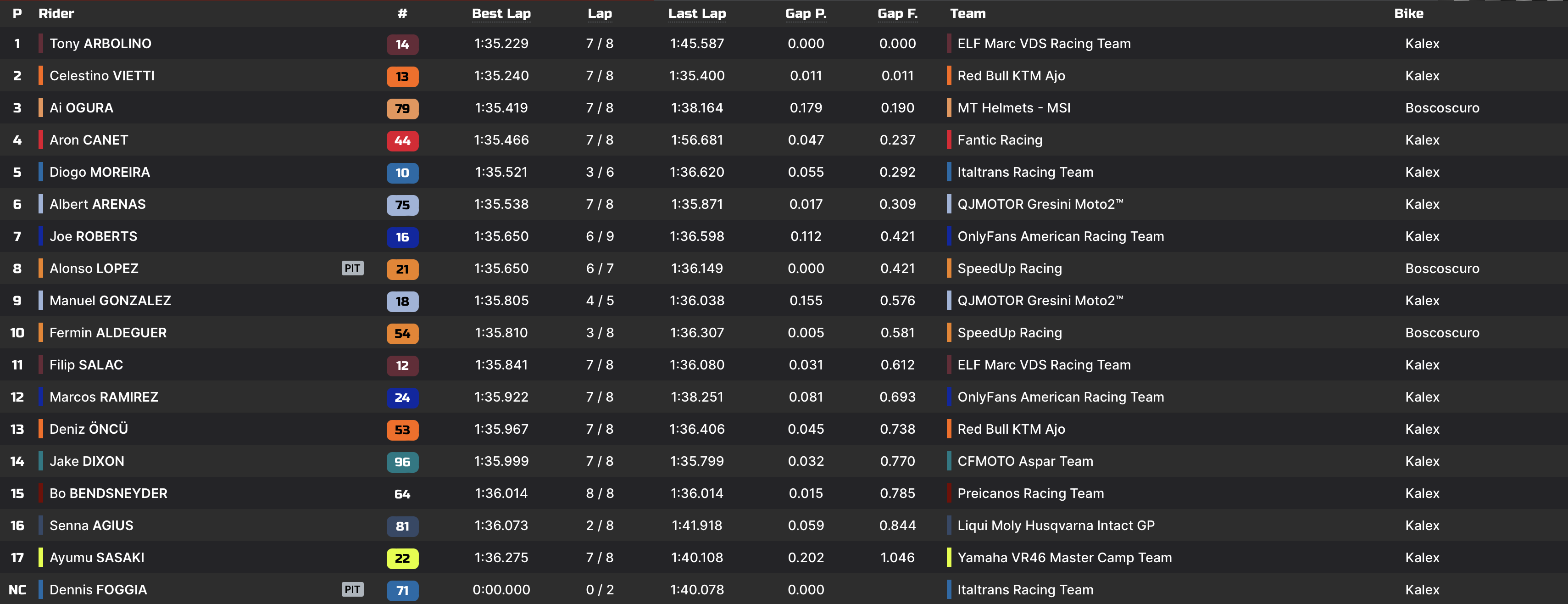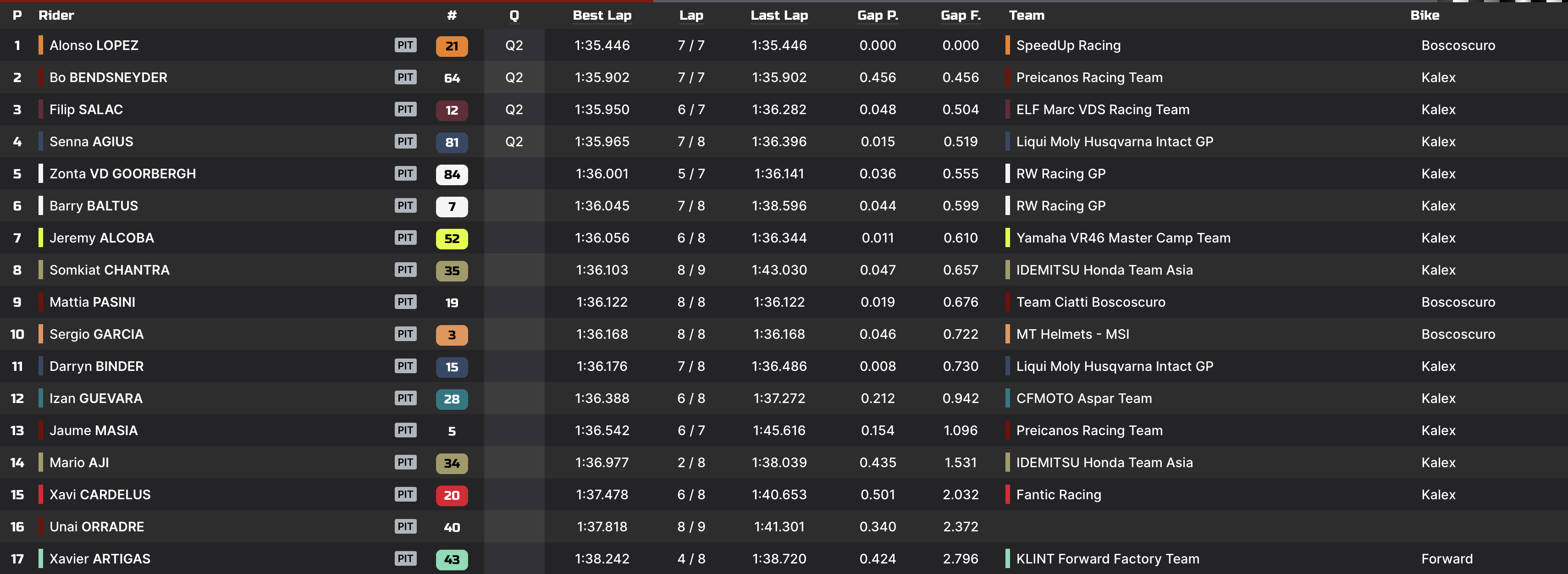 | Q2 | 1’36.201 Celestino Vietti | 1’35.229 Tony Arbolino |