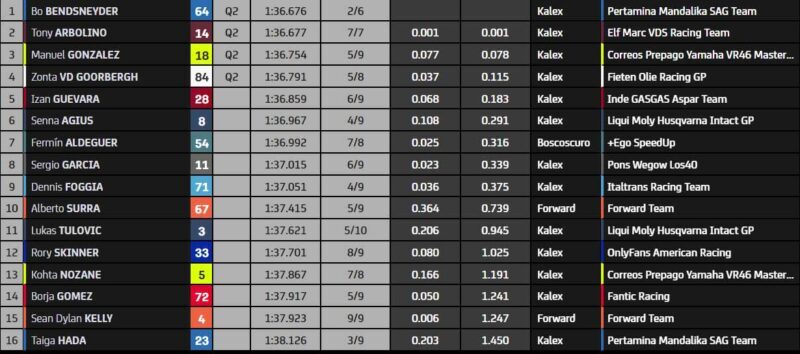 Et c’est la fin de cette séance plutôt calme ! Bo Bendsneyder termine premier, et devance Tony Arbolino pour seulement un millième de seconde ! Manuel González (Correos Prepago VR46 Yamaha Master Camp) se classe troisième, devant l’étonnant Zonta van den Goorbergh (Fieten Olie GP Racing). Hélàs, Izan Guevara termine 5e, synonyme d’élimination. Fermín Aldeguer, vainqueur à Silverstone, partira 17e.