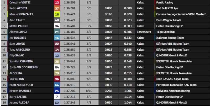 Pour son premier tour sérieux, Pedro Acosta s’empare de la première position en 1’36.281. Alors qu’on annonce la chute du vétéran Mattia Pasini, wild-card pour le week-end. La chute d’Alonso López (Speed Up Racing) met à mal les essais d’autres concurrents, gênés par les drapeaux jaunes. Acosta, lui, peut améliorer de nouveau. « Is this the dagger ? » comme le dirait un célèbre commentateur américain ? Certainement ! Aller plus vite sera difficile.