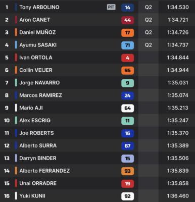 Q2 1’35.229 Tony Arbolino 1’34.935 Aron Canet 1’34.216 Daniel Holgado