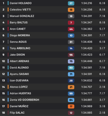 FP1 1’35.775. Tony Arbolino 1’39.682 Alonso Lopez 1’34.977 Manuel Gonzalez