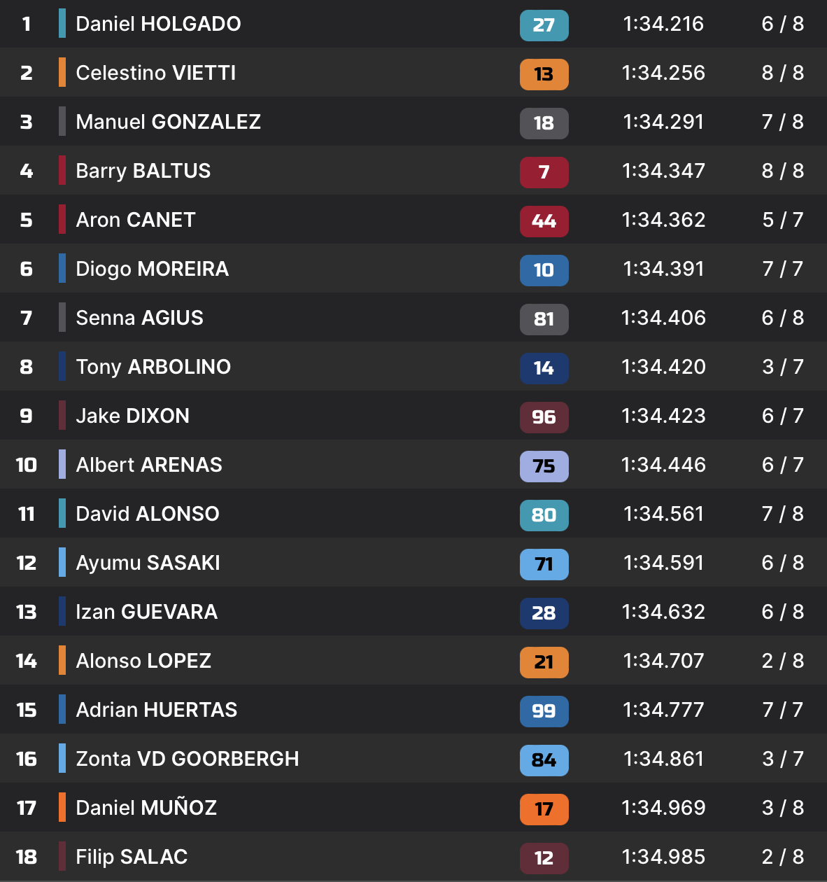 Q1 1’35.446 Alonso Lopez 1’35.351 Zonta van der Goorbergh 1’34.530 Celestino Vietti