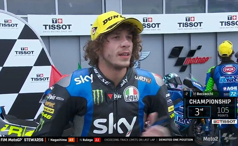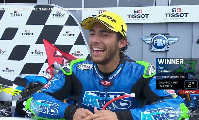 Enea Bastianini (1er) : « Je suis vraiment content de cette course. J’ai démarré la course avec le pneu soft arrière mais après deux tours ils ont commencé à diminuer et lorsque j’ai vu Marco derrière je me suis dit « merde maintenant il faut attaquer ! » (rires) J’ai attaqué autant que je le pouvais dans les deux derniers tours et finalement j’ai gagné cette course, c’est vraiment génial pour moi, pour ma famille, pour mes fans, d’être à la première place chez moi. »