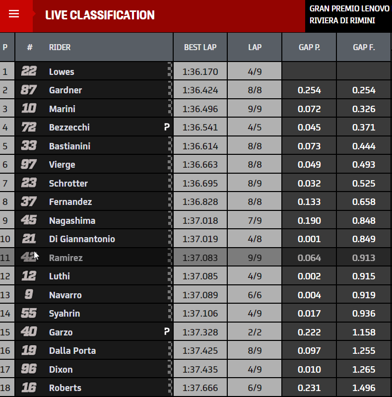 Les pilotes font l’effort en cette fin de séance mais ne parviennent pas chiper la pole position à Lowes qui s’élancera malgré tout de la Pitlane. Gardner, Marini, Bezzecchi et Bastianini sont les 4 pilotes qui s’élanceront des avants-poste demain.