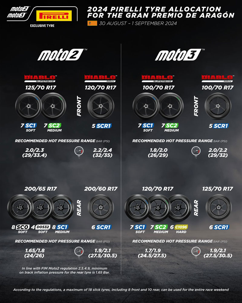 Le nouvel asphalte du MotorLand Aragón semble être particulièrement abrasif, par conséquent les pilotes Moto2™ et Moto3™ disposeront de plus de pneus et de composés que l’allocation standard Pirelli.