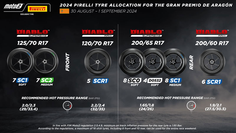 – Allocation élargie : Les pilotes de Moto2™ disposent des composés standard pour l’avant, SC1 (soft) et SC2 (medium), mais en plus grande quantité : le nombre passe de 6 à 7 unités pour chacun des deux. Pour l’arrière, les quantités des deux mélanges standards SC0 (soft) et SC1 (medium) sont les mêmes que l’allocation de base pour la saison, c’est-à-dire 8 pièces pour chaque spécification, auxquelles s’ajoutent 4 pièces de SC0 (soft) de développement dans la spécification D0532.