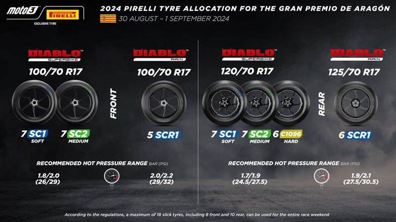 L’allocation pour le Moto3™ suit la même logique : 7 unités de chacun des composés standard, SC1 (soft) et SC2 (medium), pour l’avant et 7 pièces chacune pour le développement SC1 (soft) et SC2 (medium) à l’arrière, tandis qu’il y aura 6 exemplaires du C1096 (hard).