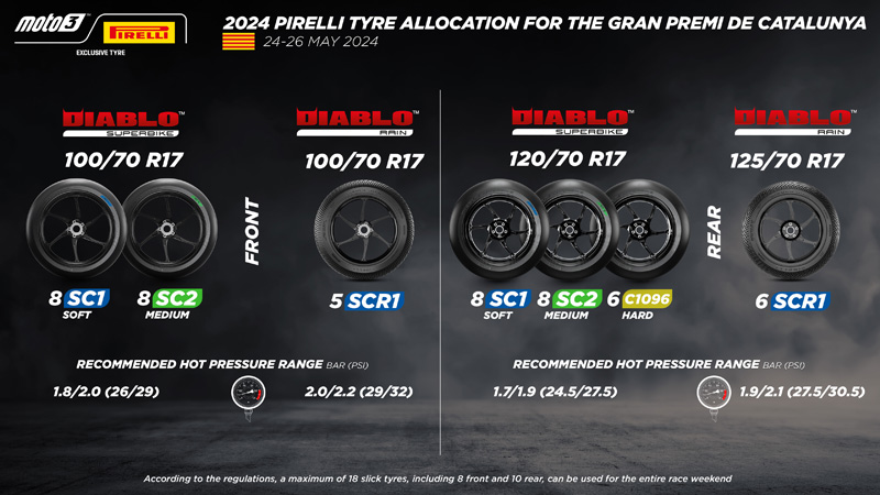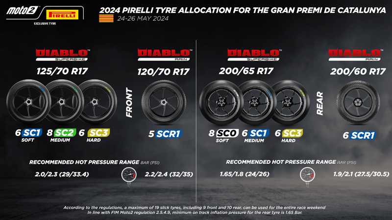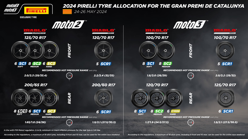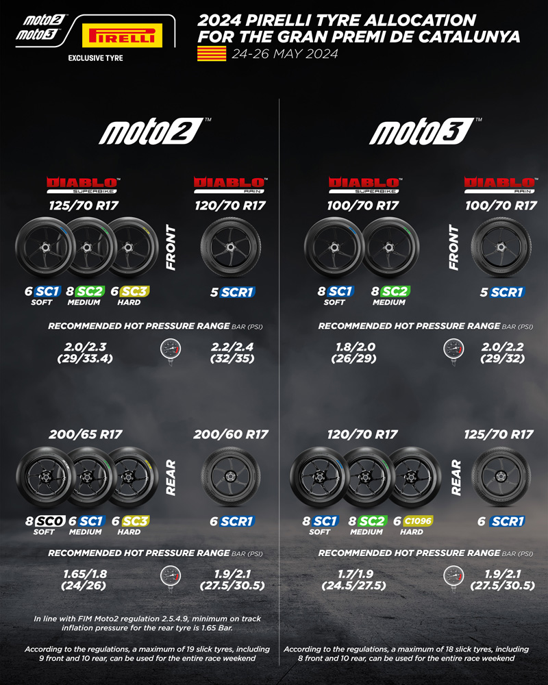 Pour l’exigeant circuit de Montmelò où se disputera le Grand Prix de Catalogne, les pilotes disposeront d’un plus grand nombre de pneus Pirelli et de certaines solutions et composés additionnels : en Moto2, la solution dure SC3 pour les deux roues, en Moto3™, la spécification arrière de développement C1096.