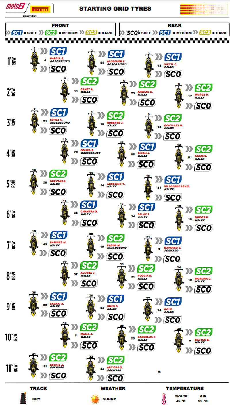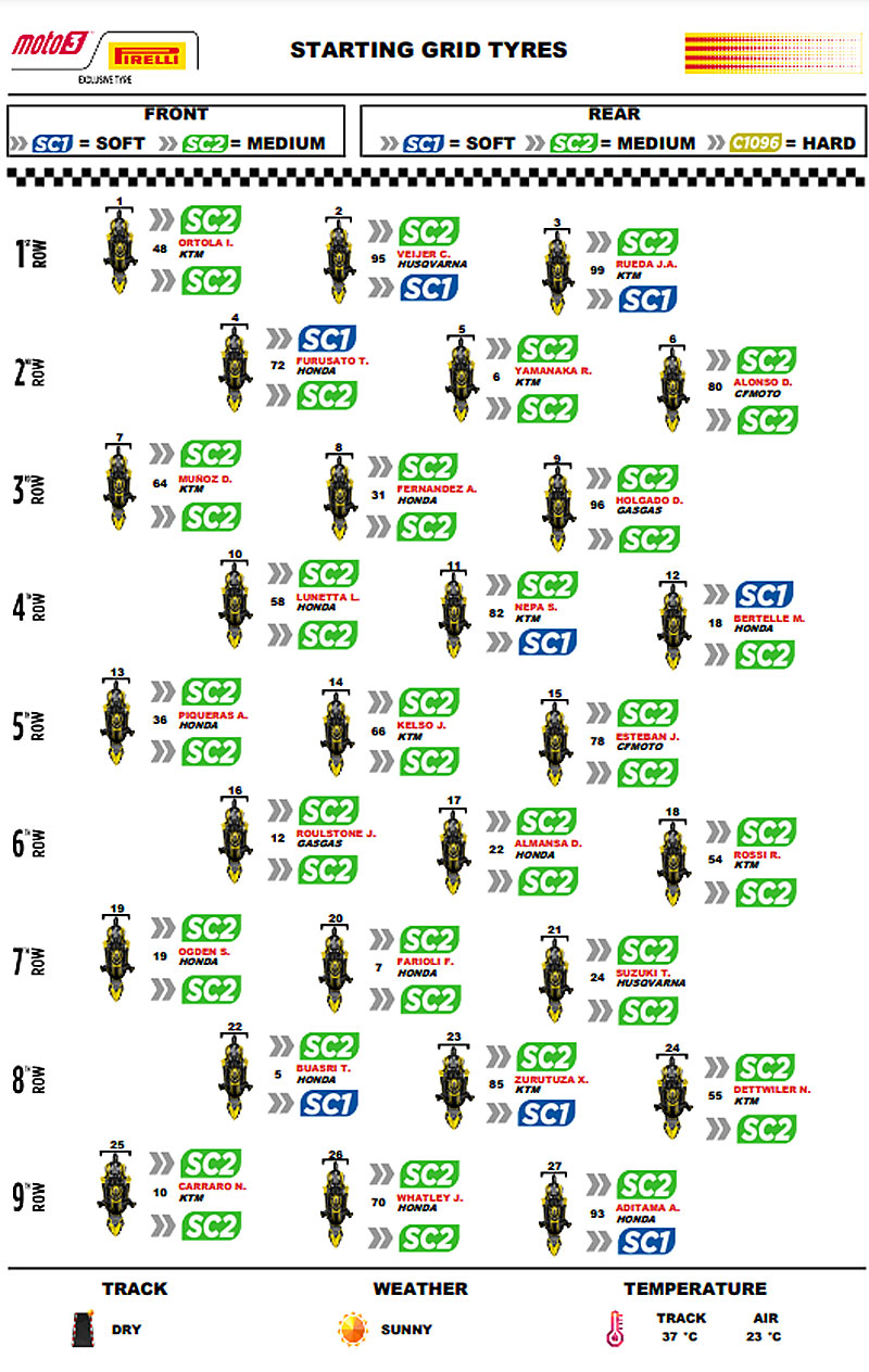 – Avec des températures d’asphalte proches de 40°C, la plupart des pilotes sur la grille ont opté pour des pneus dans le composé SC2 médium pour l’avant et l’arrière. En fait, 19 pilotes sur 27 ont choisi cette combinaison et 25 d’entre eux ont chaussé le SC2 à l’avant. David Alonso (CFMOTO Gaviota Aspar Team/CFMOTO), vainqueur de la course, et Iván Ortolá (MT Helmets-MSI/KTM), auteur de la pole position et deuxième place, ont également choisi le SC2 medium pour les deux essieux.
