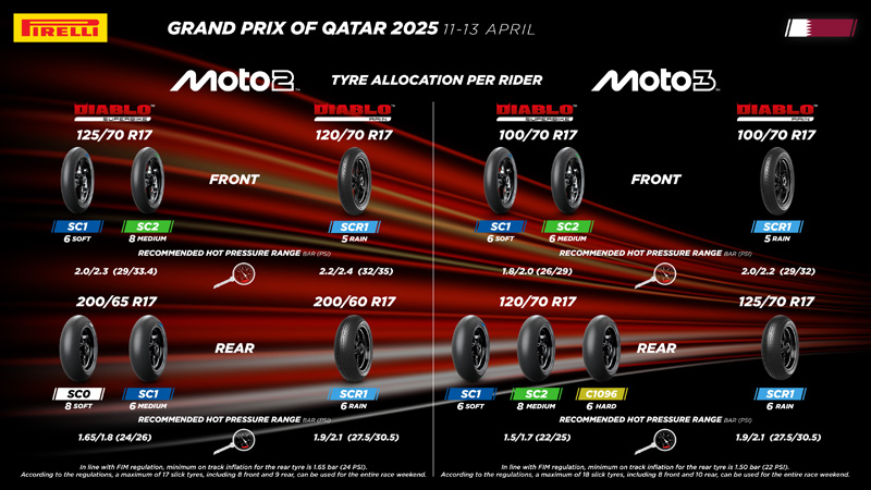 Pour cet événement, Pirelli confirme l’allocation choisie l’an dernier, composée de gommes standard à la seule exception du pneu de développement arrière dur C1096 pour la catégorie Moto3™. Étant donné qu’en Moto3™ les pilotes disposeront de trois solutions arrière, le nombre maximum de pneus arrière que, selon le règlement, ils peuvent utiliser au cours du week-end augmente également d’une unité, passant de 9 à 10 unités, tandis que le nombre de pneus avant reste inchangé avec 8 unités.