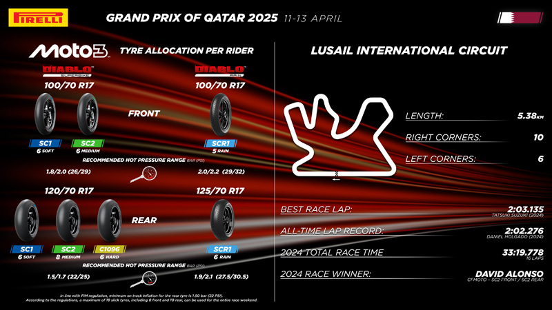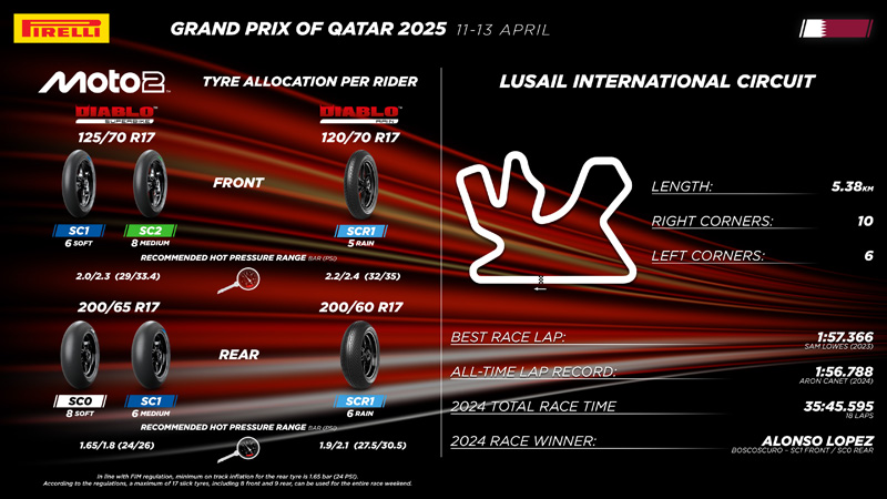 « L’année dernière, le Qatar a été notre premier Grand Prix en Moto2™ et Moto3™ car il s’agissait de la première manche du calendrier. Étant le premier GP avec Pirelli, les pilotes et les équipes ont dû l’affronter sans repères précis et avec des machines conçues pour donner le meilleur d’elles-mêmes avec les pneus du fournisseur précédent. Cette année, cependant, nous arrivons à Lusail avec trois GP déjà disputés et, surtout, avec une saison entière d’expérience, à la fois la nôtre et celle des équipes et des pilotes qui connaissent maintenant beaucoup mieux nos pneus. De plus, nous disposons désormais de cadres et de motos qui, par rapport à 2024, sont optimisés pour mieux fonctionner avec nos pneus. Nous pensons que l’allocation choisie pour la saison dernière était correcte et c’est pour cette raison que nous avons décidé de la confirmer également pour cette année ; par conséquent, les pneus disponibles pour les pilotes des deux classes seront identiques à ceux de 2024, la seule différence étant le passage de la jante avant de 3,75 pouces à la jante de 3,5 pouces en Moto2™. En gardant l’allocation inchangée, nous serons en mesure d’apprécier plus facilement les améliorations que nous espérons réaliser par rapport à la saison dernière afin de démontrer le véritable potentiel de nos pneus également sur cette piste qui, il faut le rappeler, reste un circuit assez exigeant pour les pneus, notamment en termes d’usure ; une bonne configuration de la moto pourrait donc faire la différence et permettre de faire bon usage même des composés les plus tendres. »