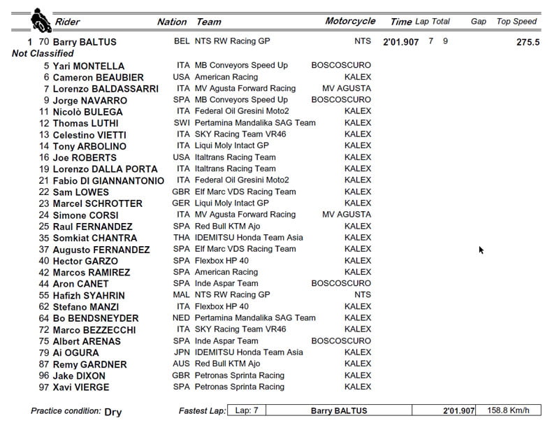 On a ensuite assisté à un spectacle attendu en Moto2, avec un seul pilote en piste. Après Stefano Manzi (Kalex, Pons HP 40, #62) hier, cela a été ce matin au tour de Barry Baltus (NTS, NTS RW Racing GP, #70) d’avoir la piste pour lui tout seul, les autres préférant économiser les kilomètres de leur moteur Triumph…