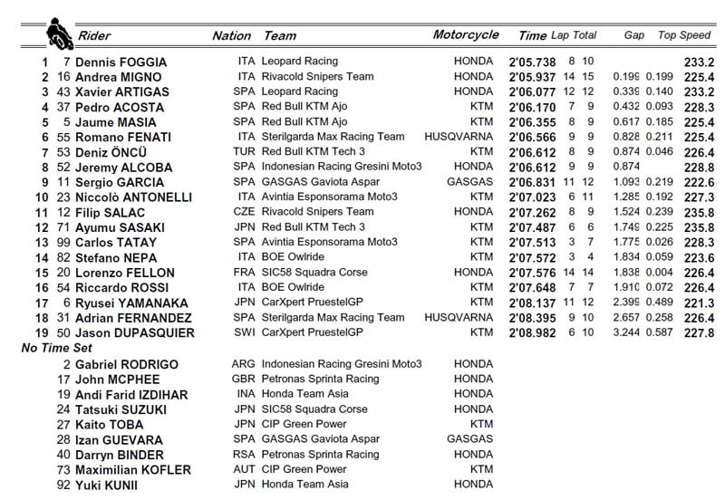 Ce matin, Dennis Foggia et Andrea Migno sont descendus sous la barre des 2’06, malgré le vent toujours présent, mais sans toutefois égaler leur meilleur chrono de la veille. Pour rappel, le record du meilleur tour en course est en 2’05.403 réalisé par Romano Fenati en 2019, tandis que le record absolu est en 2’04.561 établi par Arón Canet en 2019. Le meilleur tour de l’année dernière lors du GP a été enregistré en 2’05.788 grâce à Ai Ogura. Pour être complet, les essais du Qatar 2020 se sont terminés par un 2’04.892 de Filip Salač.