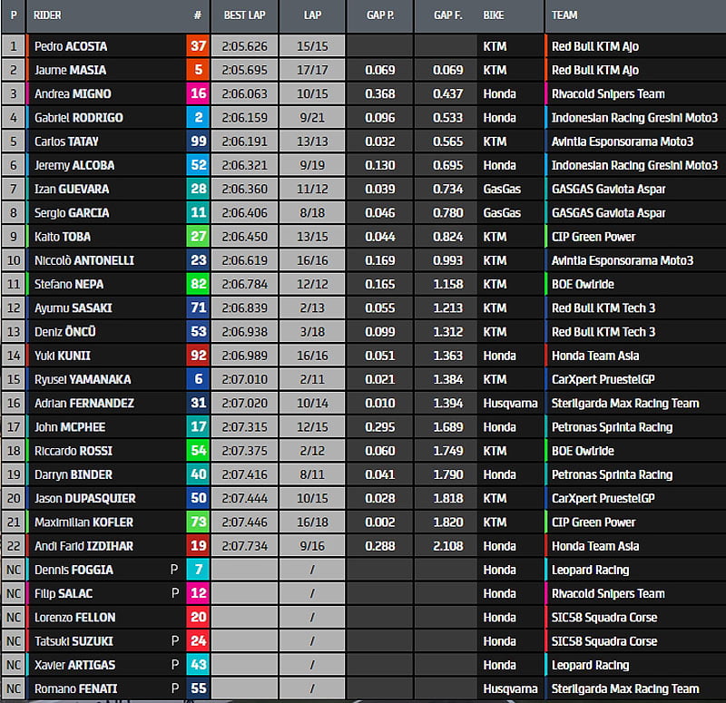 La deuxième observation tient dans la composition des hommes forts du moment, que l’on retrouve quasi systématiquement dans le groupe de tête: John McPhee (Honda, Petronas Sprinta Racing, #17), Andrea Migno (Honda, Rivacold Snipers Team, #16), Dennis Foggia (Honda, Leopard Racing, #7) et Jaume Masià (KTM, Red Bull KTM Ajo, #5) forment le pack solide auquel il va sans doute falloir se confronter pour espérer finir sur une des trois marches…