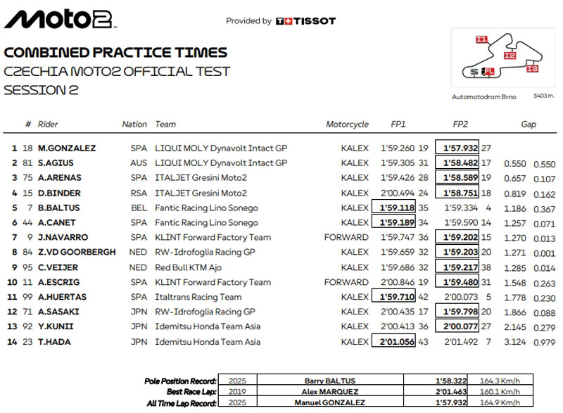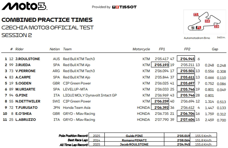 L’après-midi, ce dernier progressait en 2’04.945 et devenait de fait l’homme le plus rapide sur le tracé tchèque en catégorie Moto3, même si à notre connaissance les chronos inscrits lors des tests officiels ne sont pas comptabilisés dans les records officiels (contrairement à ce qui est indiqué sur ces feuilles de temps).