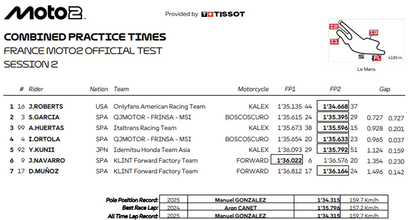 Parmi elles, seules QJMOTOR – FRINSA – MSI et KLINT Forward Factory Team étaient au complet, mais c’est Onlyfans American Racing Team, avec Joe Roberts, qui s’est montrée la plus rapide, avec un meilleur chrono en 1’34.668, soit à 3 dixièmes du record du circuit réalisé trois jours auparavant par Manuel Gonzalez (LIQUI MOLY Dynavolt Intact GP) en 1’34.315 avant de remporter le Grand Prix.