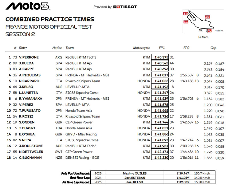 Pourtant, c’est le rookie du team Red Bull KTM Tech3, l’Argentin Valentin Perrone, 10e du GP, qui a réalisé le meilleur temps en 1’40.375, à moins de 4 dixièmes du record absolu de la piste détenu par Maximo Quiles en 1’39.947.