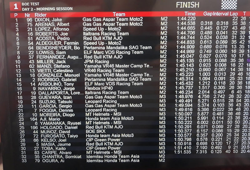 Evidemment, test privé oblige, aucun chrono officiel n’est à notre disposition, mais voici ceux réalisés à la pause déjeuner, et le moral des teams n’est pas bien compliqué à percevoir, surtout chez Alonso López, le plus que probable remplaçant de Romano Fenati après ce test espagnol…