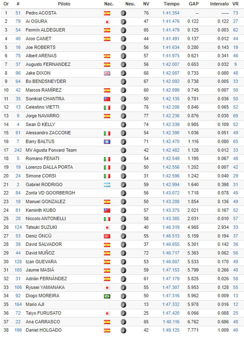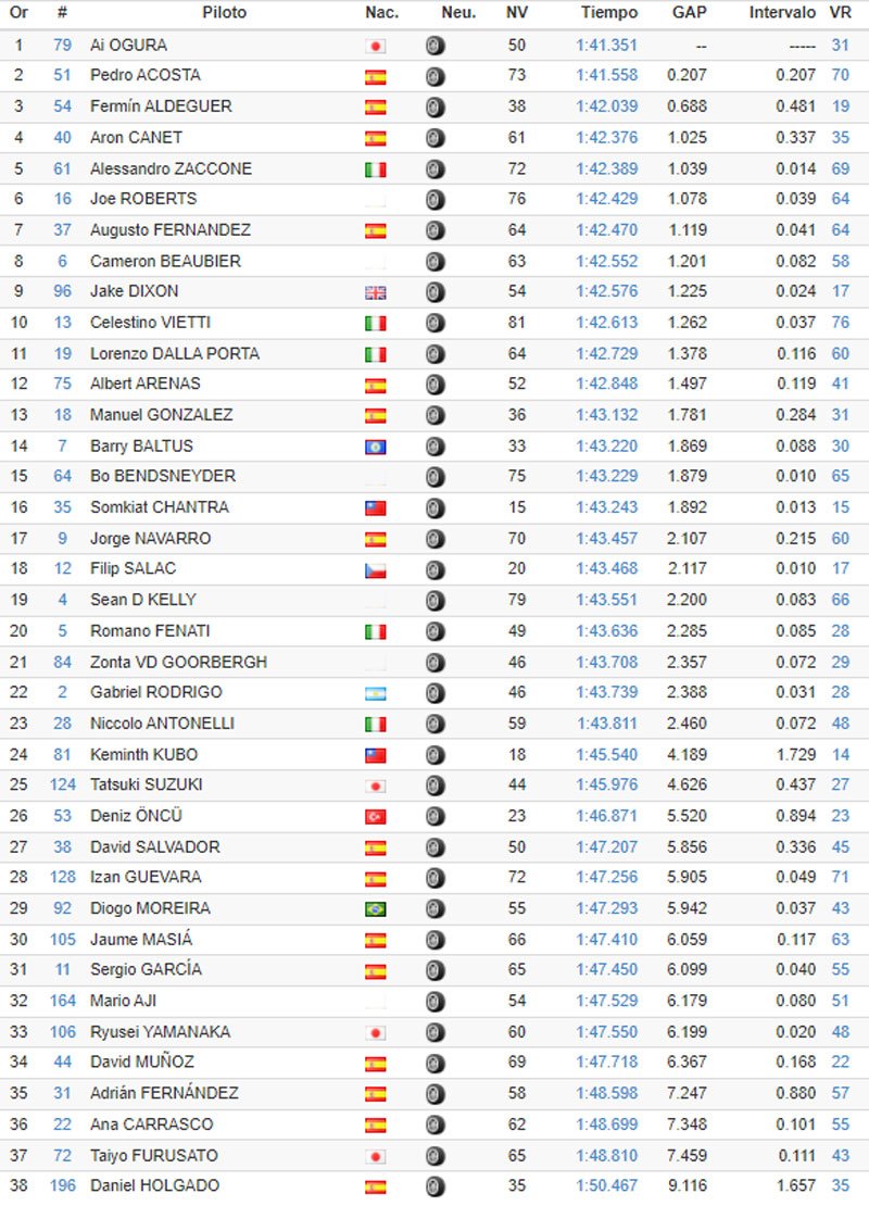 Est-ce la raison pour laquelle la journée du jeudi n’a pas permis d’améliorer les chronos du mercredi ? Toujours est-il que le rookie Pedro Acosta s’est mis en valeur, s’avérant le plus rapide de la séance, devant Ai Ogura. Le champion du monde Moto3 2021 a réalisé 1’41.354, soit 3 millièmes de plus que le Japonais la veille. Celui-ci reste donc le plus rapide de ces deux jours, en 1’41.351 alors que son coéquipier Somkiat Chantra avait roulé en 1’41.466 la semaine dernière, assez proche du meilleur tour en course qui appartient à Sam Lowes en 1’41.313, le record officiel étant toujours détenu par Remy Gardner en 1’40.667.
