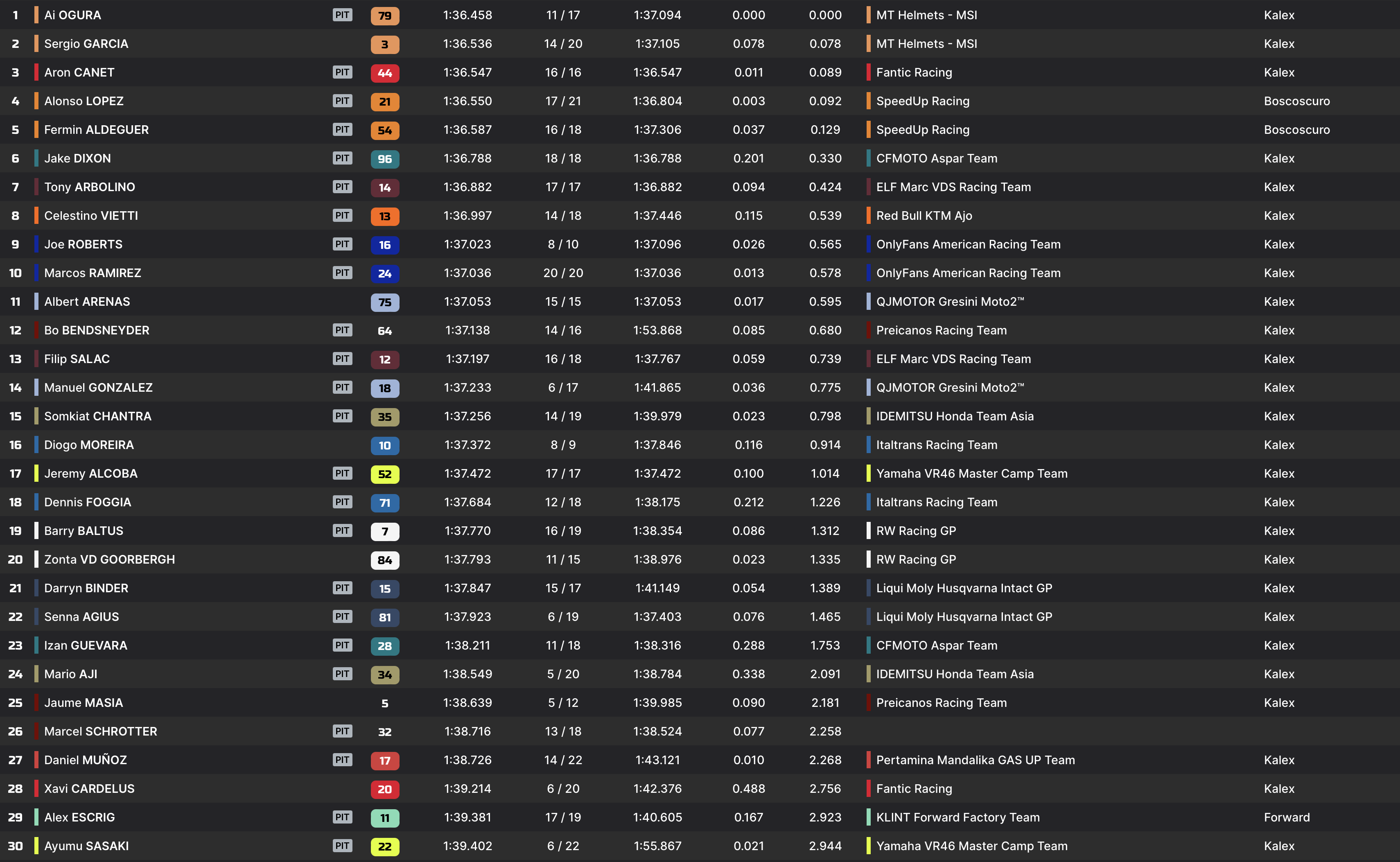 Devant le drapeau à damier, personne n’est cependant en mesure d’inquiéter Ai Ogura qui débute les hostilités de la meilleure des manières. MT Helmets MSI signe un doublé grâce à Sergio Garcia. Aron Canet empêche chacun des pilotes SpeedUP de revendiquer un top-3 en signant un temps en 1:36.547 sur le fil.