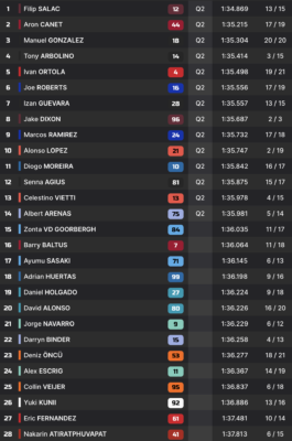 Dans la cohue, Filip Salac parvient à signer un chrono en 1:34.869 pour se mettre devant. Aron Canet et Manuel Gonzalez complètent le top-3. Le classement final est plutôt surprenant. Hors du top-14, on retrouve les deux pilotes Aspar, David Alonso et Dani Holgado, mais aussi Barry Baltus et Deniz Öncü. Tous ces pilotes devront passer par la Q1, où quatre places seront encore disponibles pour la suite des Qualifications.